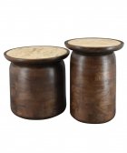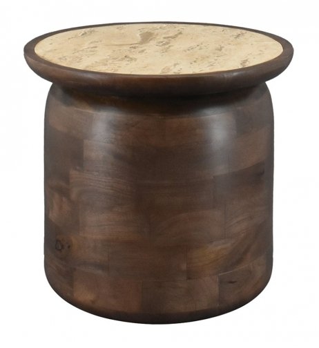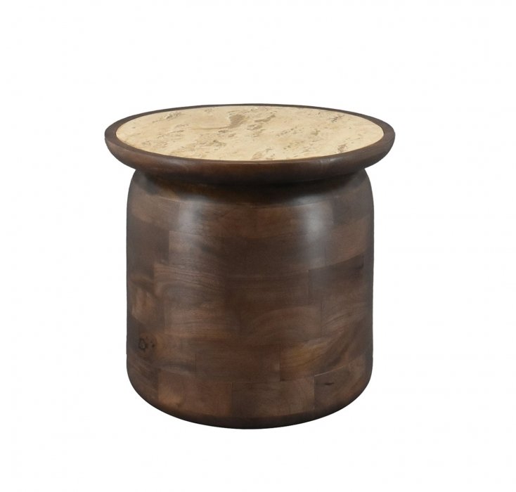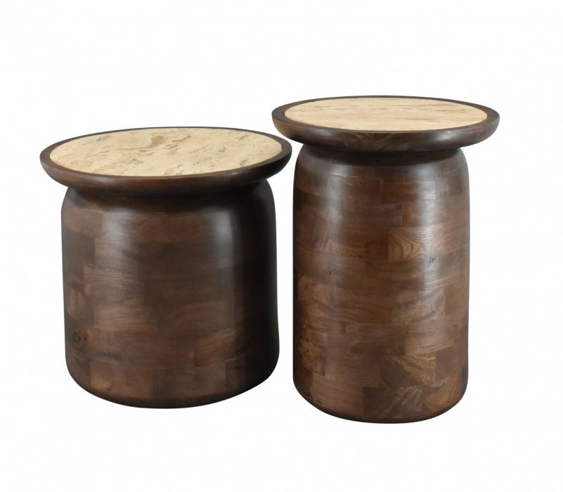 Dieser stilvolle Beistelltisch kombiniert eine Basis aus Mangoholz mit Walnut Brown Finish mit einer eleganten Travertinplatte. Die Kombination aus warmem Holz und Naturstein sorgt für eine luxuriöse und zeitlose Ausstrahlung. Mit einem Durchmesser von 45 cm und einer Höhe von 40 cm bietet der Tisch ausreichend Platz für Getränke, Bücher oder Dekoration. Lässt sich wunderbar mit dem kleineren Tisch aus derselben Serie kombinieren.